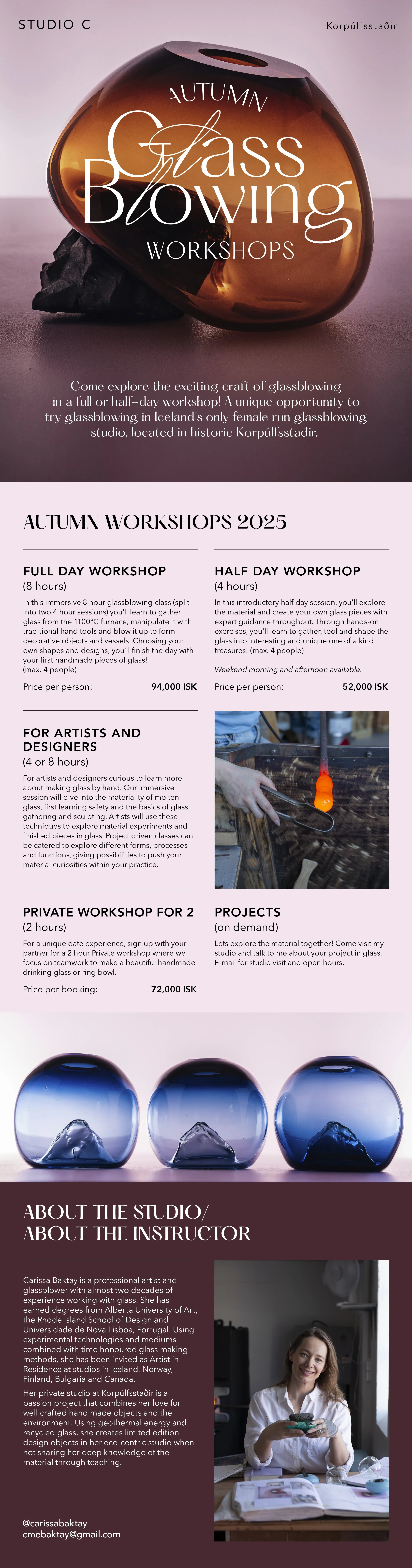 Carissa Baktay er maglaga og fagleg fjöllistakona með rúmlega 20 ára reynslu af því að vinna með glerlist. Einkastúdíóið hennar á Korpúlfsstöðum er ástríðuverkefni sem fléttar saman ást hennar á fallegum handgerðum munum og umhverfisvænni nálgun. Með hreinu orkunni sem Ísland hefur upp á að bjóða og endurunnu gleri, býr hún til takmarkað uppboð af hönnunum og munum. Á milli þess sem hún kennir öðrum og deilir af sinni ríku þekkingu um listformið á vinnustofum.