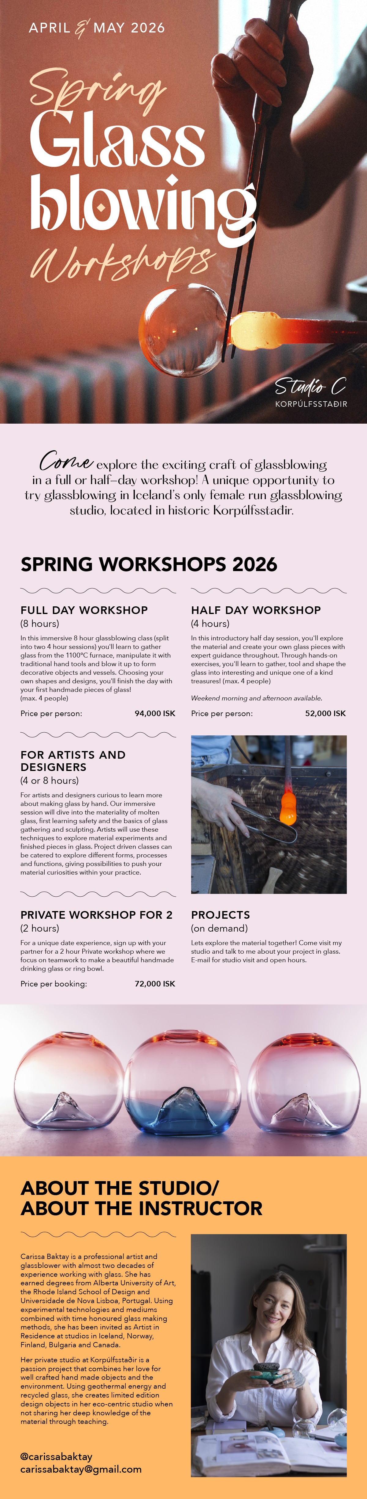 Carissa Baktay er maglaga og fagleg fjöllistakona með rúmlega 20 ára reynslu af því að vinna með glerlist. Einkastúdíóið hennar á Korpúlfsstöðum er ástríðuverkefni sem fléttar saman ást hennar á fallegum handgerðum munum og umhverfisvænni nálgun. Með hreinu orkunni sem Ísland hefur upp á að bjóða og endurunnu gleri, býr hún til takmarkað uppboð af hönnunum og munum. Á milli þess sem hún kennir öðrum og deilir af sinni ríku þekkingu um listformið á vinnustofum.